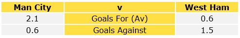Firstly, the Home team... Man City are averaging between 2 and 3 (2.1) Goals For per match. While the Away team West Ham are conceding an average of between 1 and 2 (1.5) Goals Against. Matching-up these two figures indicates that Home team Man City can be expected to score about 2 Goals.