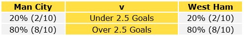 In this case, 80% (8 out of 10) of Man City's Home matches have produced more than 2 Goals. With 80% (8 out of 10) of West Ham's Away matches also producing more than 2 Goals.
