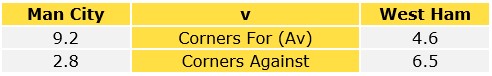 Firstly, the Home team... Man City are averaging between 9 and 10 (9.2) Corners For per match. West Ham are conceding an average of about 7 (6.5) Corners Against. So matching-up this data indicates that Man City can be expected to get between 7 and 10 Corners.