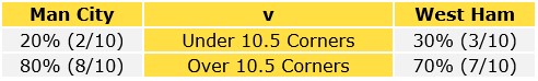 With 8 of Man City's 10 Home matches (80%) going Over 10.5 Corners and 7 of West Ham's 10 Away matches also going over the 10.5 mark, an Over 10.5 Corners bet would be the call.