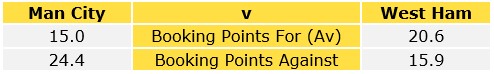 Firstly, the Home team... Man City are receiving an average of 15.0 Booking Points (1 Yellow Card) per match. And Away team West Ham's opponents have been receiving an average of 15.9 Booking Points (1 Yellow Card).