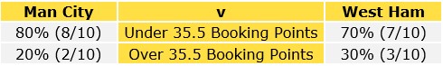 80% (8 out of 10) of Man City's Home matches and 70% (7 out of 10) of West Ham's Away matches have produced 35 Booking Points (or 3 Cards) or less.