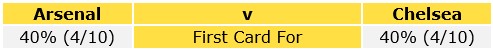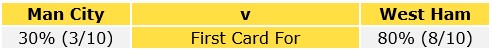 Matching-up the teams' data showed, Man City have received the First Card in 30% (3 out of 10) of their Home matches. West Ham have received the First Card in 80% (8 out of 10) of their Away matches, making them the clear choice.